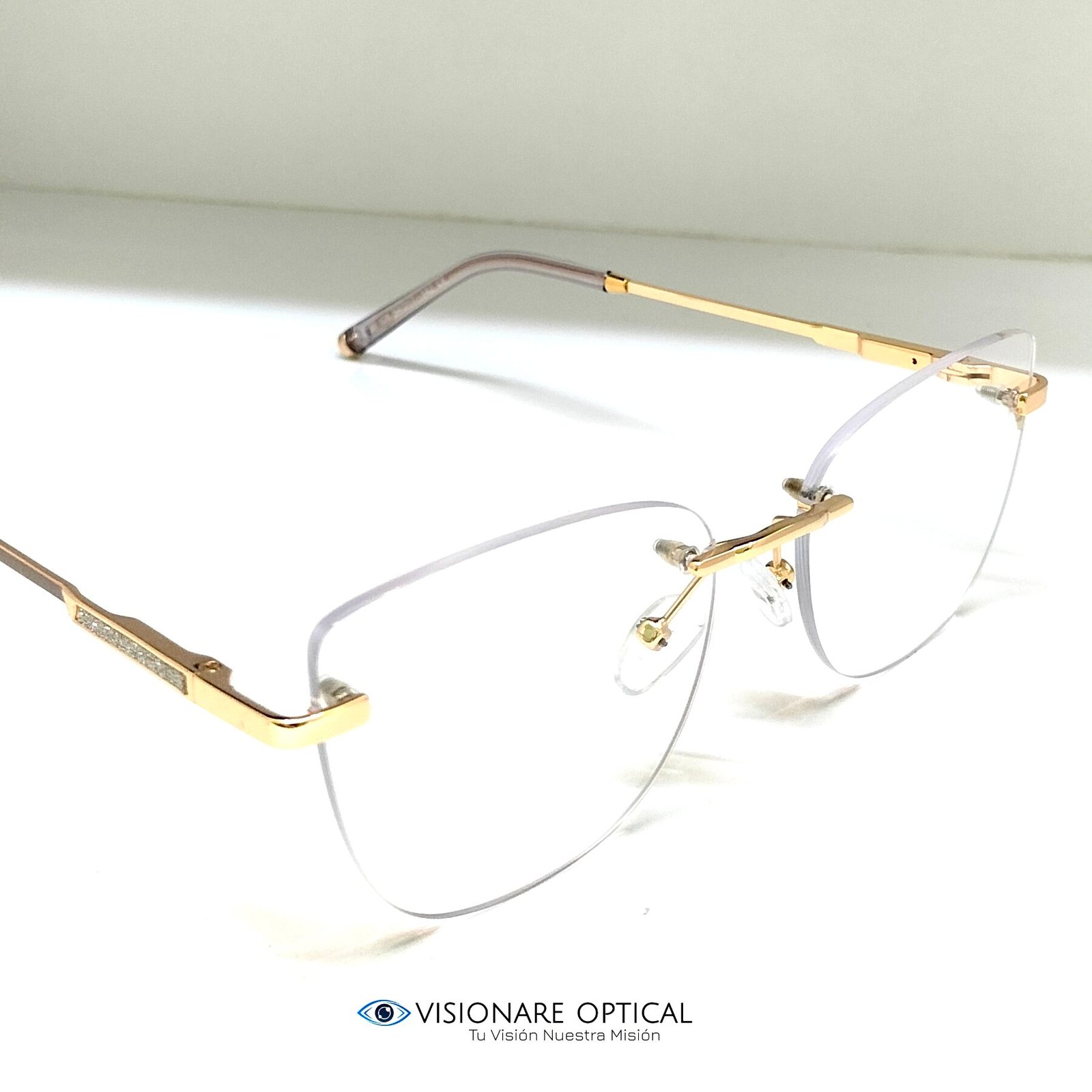 Montura femenina elegante tipo rimless, con delicados acabados en dorado y detalles brillantes que realzan tu estilo con sofisticación.
